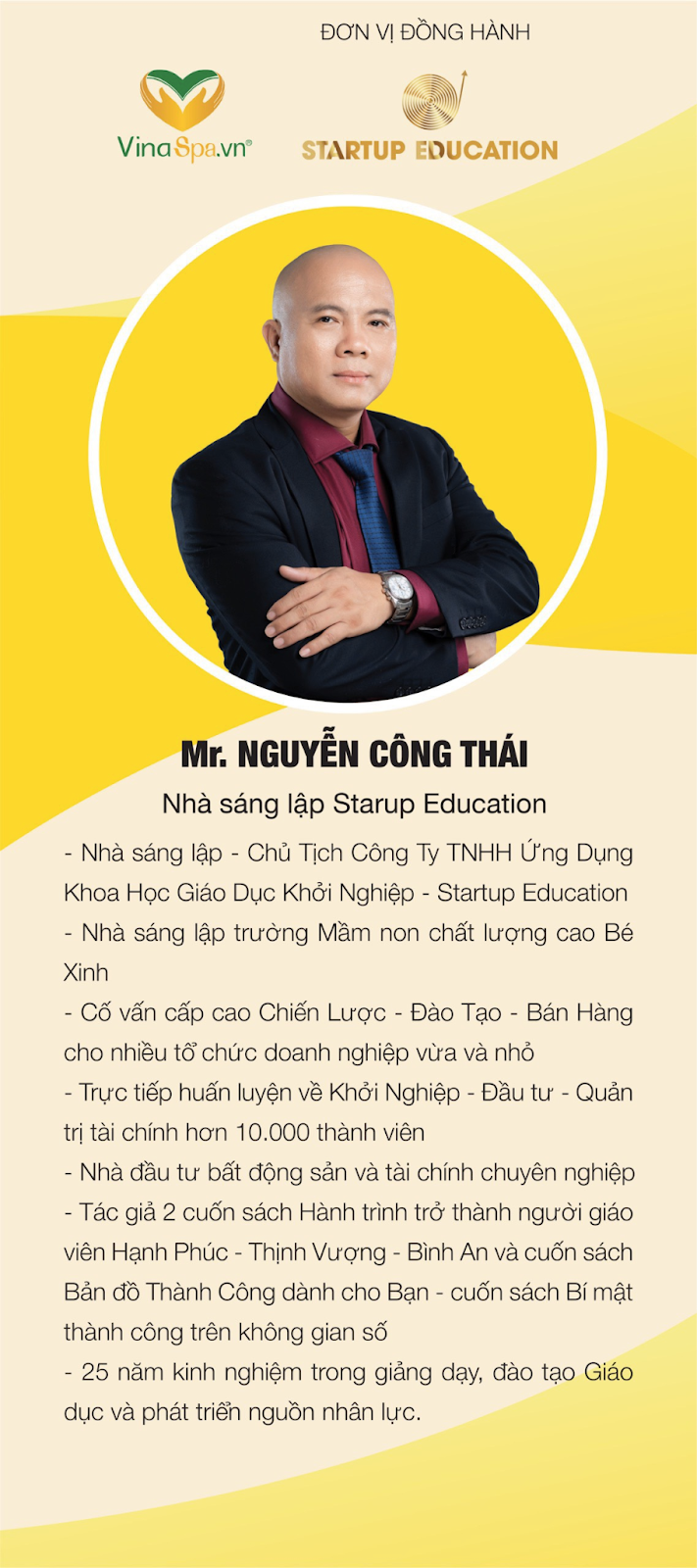 Bên cạnh đó, bà cũng chân thành gửi lời cảm ơn tấm chân tình của Thầy Nguyễn Công Thái một nhà trí thức đạo đức vĩ đại muốn cống hiến cả đời mình cho ngành Giáo dục Việt Nam. Thầy tâm quyết cho xuất bản cuốn sách “Bản đồ thành công dành cho Bạn” cũng nhận lời làm Cố vấn cấp cao cho Ngành Massage và Spa khởi nghiệp Thành công. “Khoá học cho 200 giáo viên đầu ngành Massage và Spa vào tháng 11 sắp tới, dành tặng các Bạn cùng đồng hành thay đổi cách nhìn cho ngành Massage và Spa. Khóa học Bản đồ thành công dành cho Bạn, Gồm có :